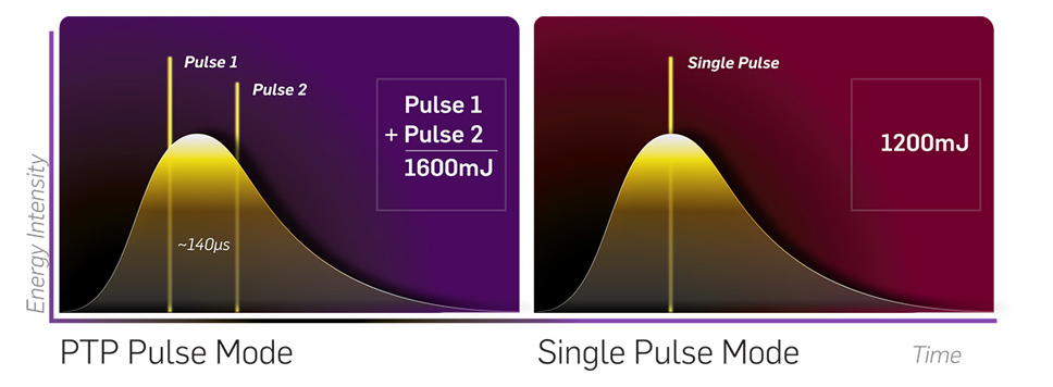PTP (Photoacoustic Technology Pulse)는 50~80us의 시간을 두고 연속으로 두 개의 빔이 출력되는 새로운 기술입니다.