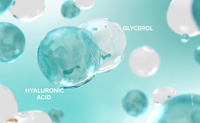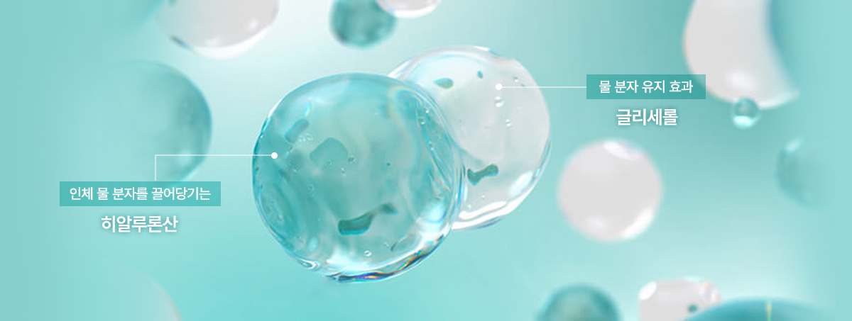 히알루론산은 체내 물 분자를 끌어당겨주며, 글리세롤이 끌어당긴 물 분자가 오래 유지되도록 도와줍니다.